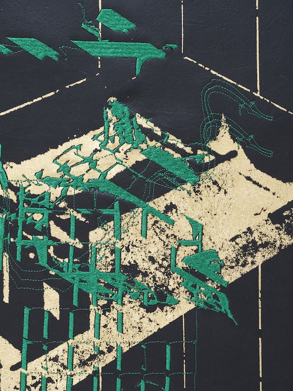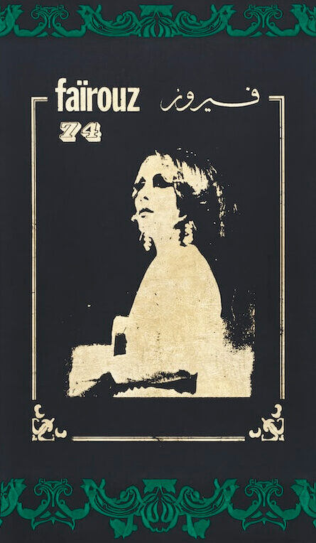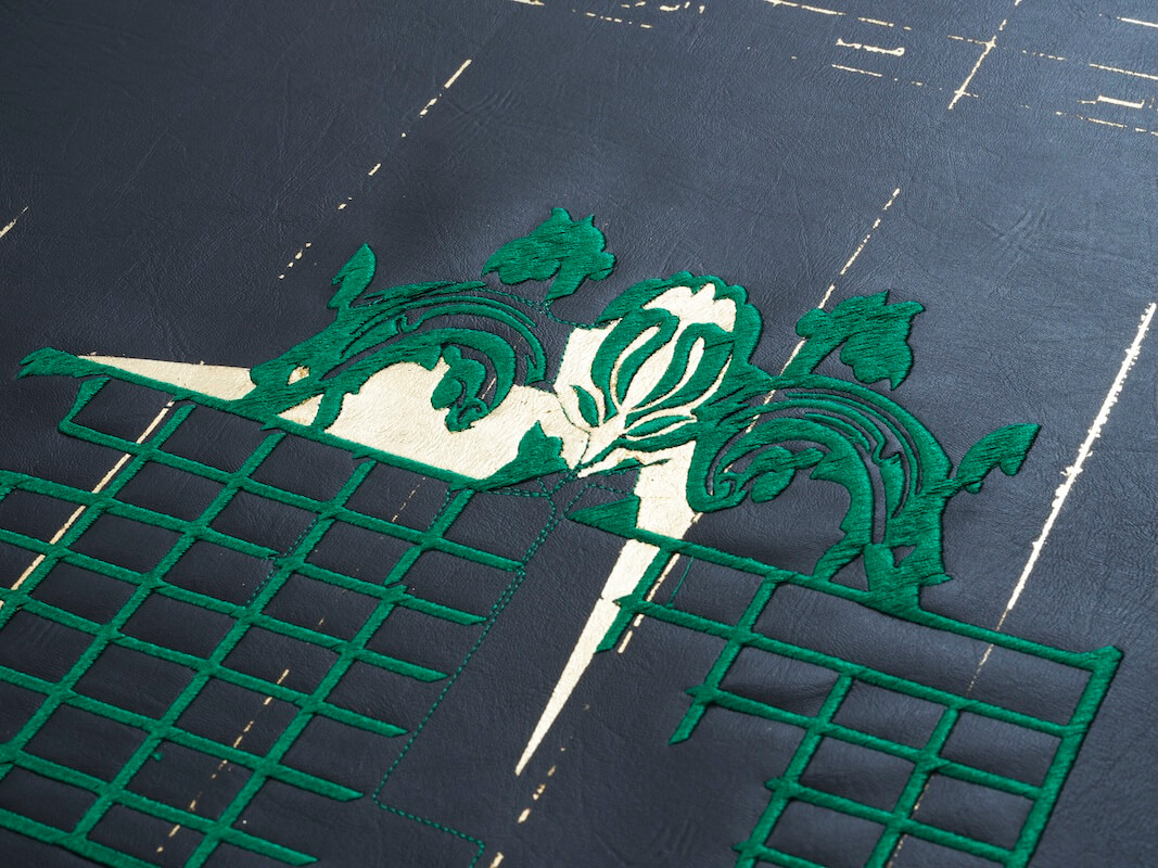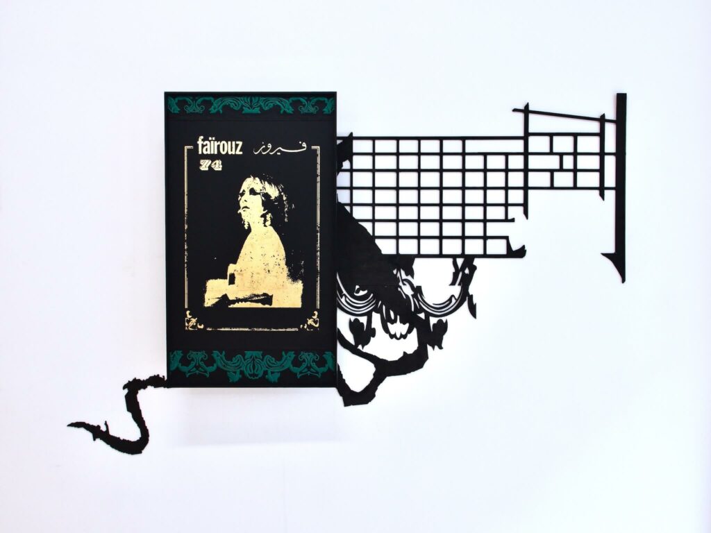 These impressions formed the visual vocabulary of the project. I translated those references into compositions using screen printing, gold leaf, digital embroidery, and laser-cut wall reliefs. The visual language drew on a wide range of motifs: Fairuz, the iconic singer whose voice shaped my father’s childhood and marked his absence, and elements from our family’s carpet patterns, which I deconstructed and reassembled, layering them with the urban grid of what was once “City of revolution.” The compositions bridge personal and collective topographies.