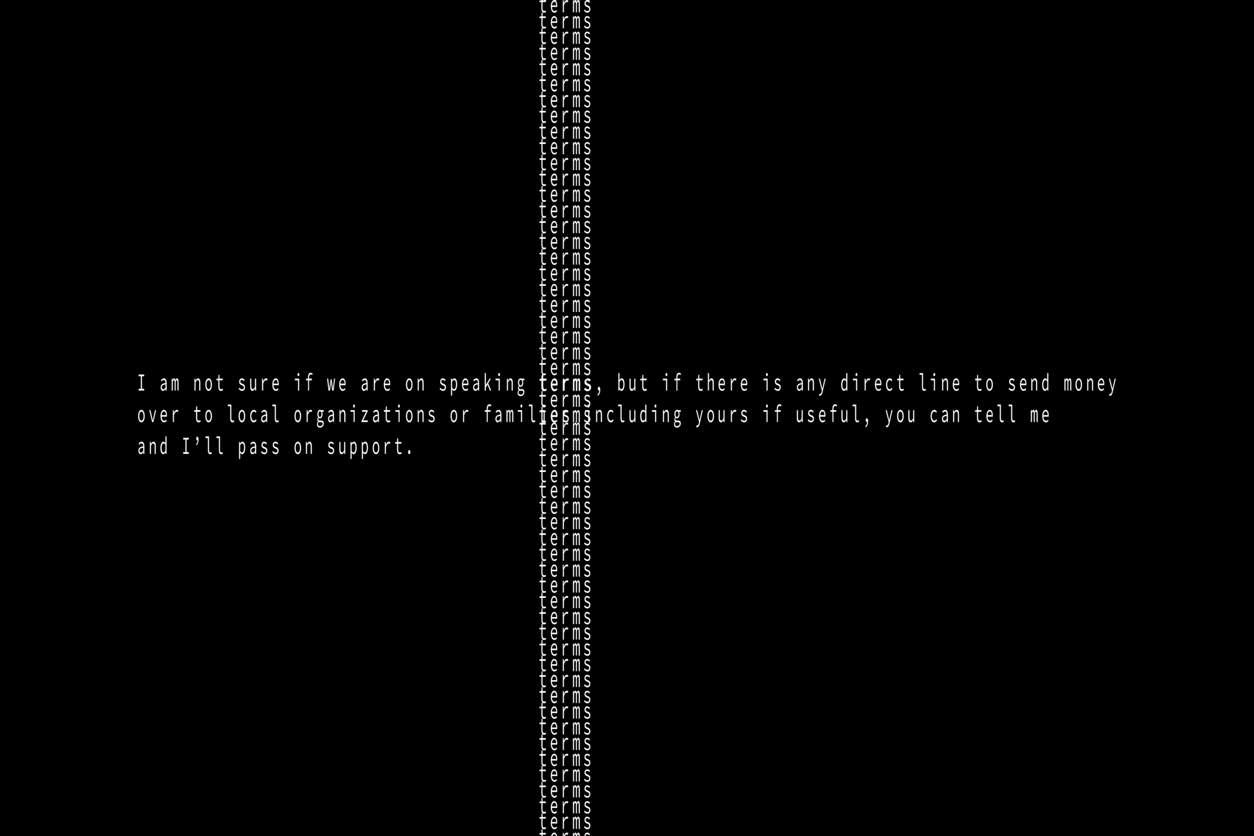 Across the work, the interplay of silence and speech, absence and presence, reveals the ethical stakes embedded in language. By foregrounding the empty gestures of empathy, Yamani’s artwork calls attention to the ways linguistic structures maintain complicity. It demonstrates that language is never neutral: it shapes, erases, and validates, and it is within this field that resistance must operate. Checking In compels viewers to confront not only what is said, but how it is said, and what remains unspoken.